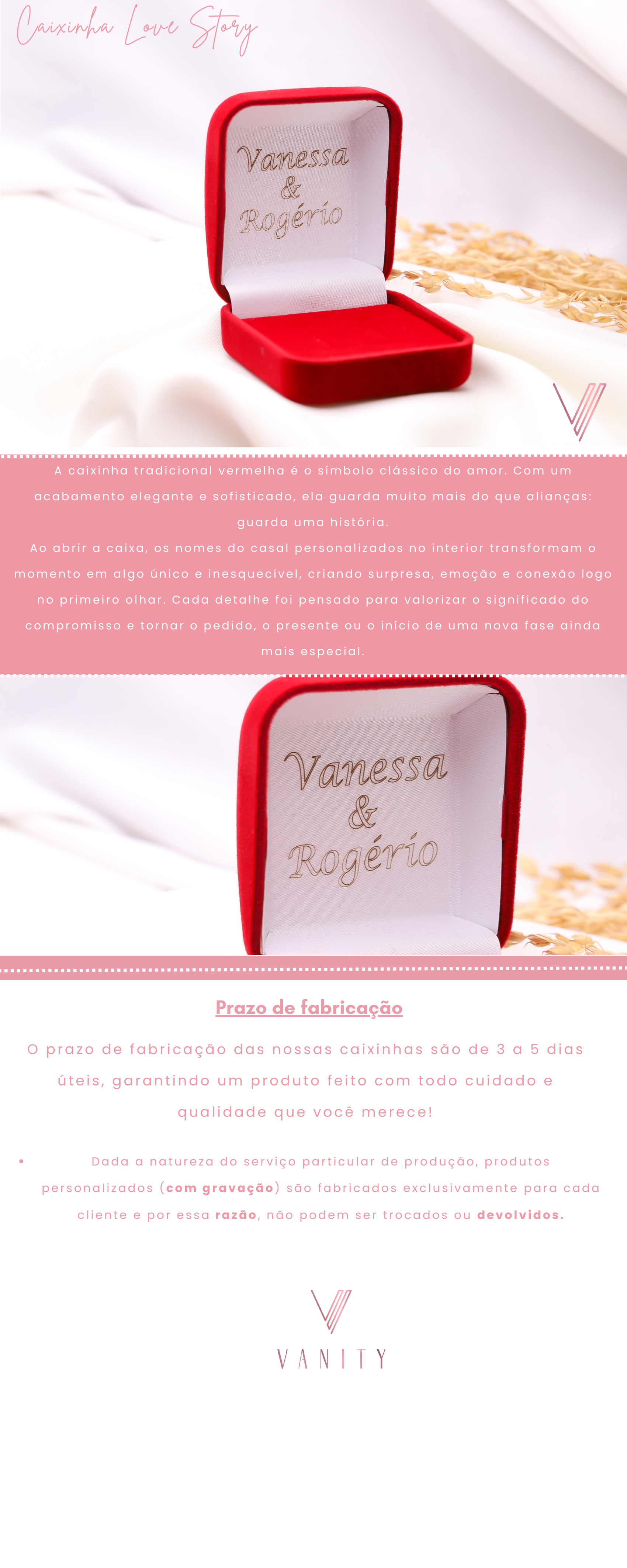 tudo incrível!!!!! a todo momento me acolheram e tiveram MUITAAA paciência, ja que sou uma pessoa ansiosa, perguntava a todo tempo sobre as alianças e todos muito pacientes comigo, me respondiam sempre que dava! As alianças chegaram impecáveis, eu amei muito, são lindas!!! com certeza que se eu algum dia pensar em trocar, vou recorrer a Vanity!